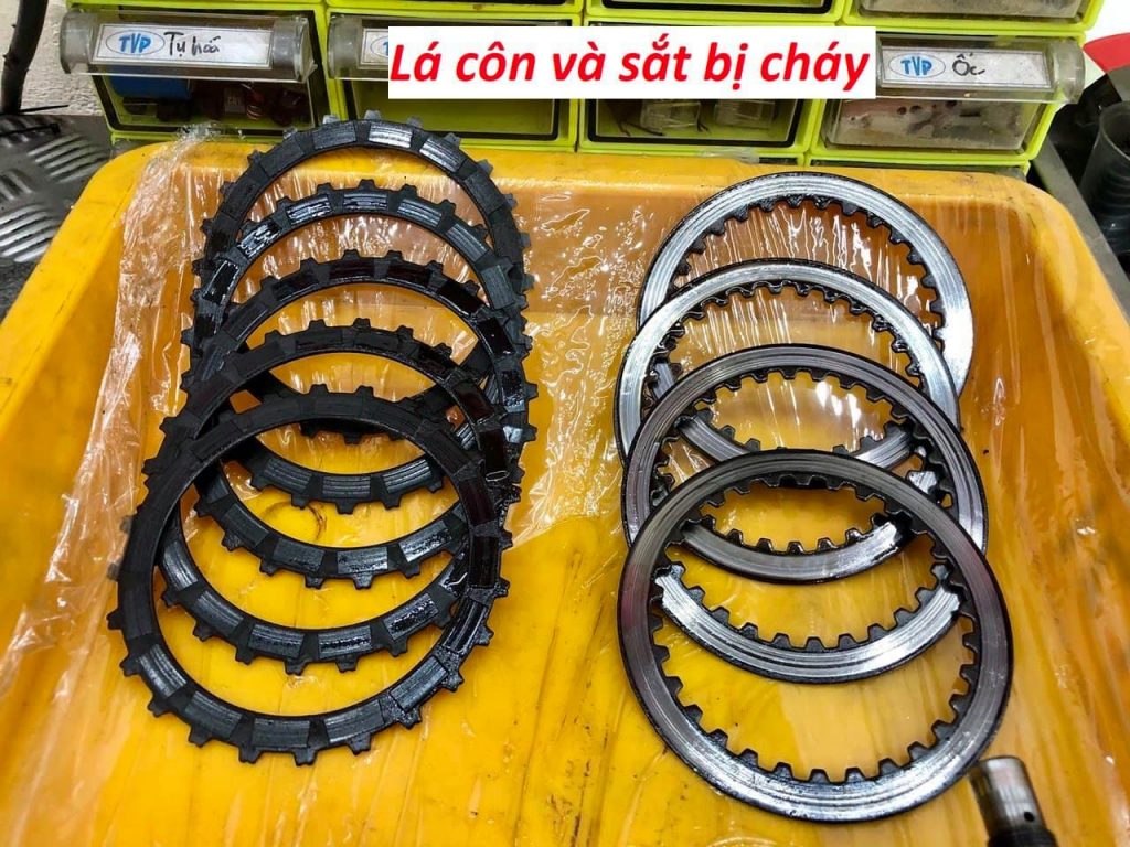 - Với các trường hợp như chưa biết sử dụng côn, vê côn, lắp đặt hành trình côn không đúng, đặc biệt là “cho bạn mượn xe” rất dễ làm cháy côn. Có thể cháy 1 bộ côn chỉ sau vài chục km… Đặc điểm là tháo dầu nhớt rất đen, có thể xuất hiện mạt lá bố bị mài ra, lá bố lá sắt cháy đen… những bộ côn này bắt buộc phải thay thế ngay, không thể sử dụng được nữa.