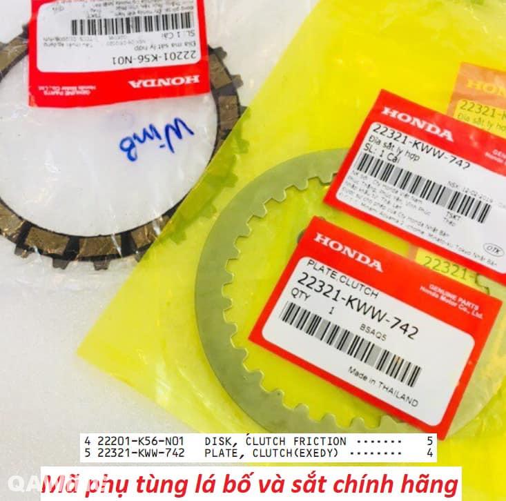 - Một bộ côn Winner hoàn chỉnh gồm 5 lá bố (Mã phụ tùng: 22201-K56-N01) và 4 lá sắt (Mã phụ tùng: 22321-KWW-742). Các bạn nên kiểm tra kĩ mã phụ tùng để chắc chắn được thay thế hàng chính hãng, đảm bảo chất lượng.