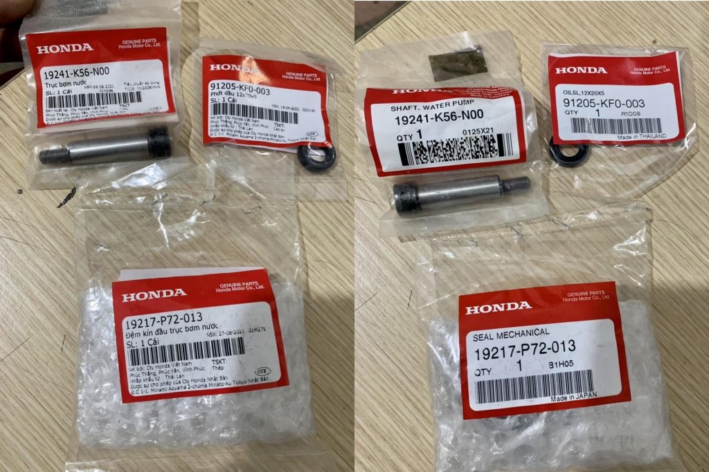 - Để khắc phục hoàn toàn cần tháo bỏ phớt cũ, vệ sinh buồng bơm và thay thế các chi tiết: phớt dầu, phớt nước và trục bơm nước. Tổng chi phí tạm tính là 800k chưa kể phát sinh (toàn bộ phụ tùng Honda chính hãng).